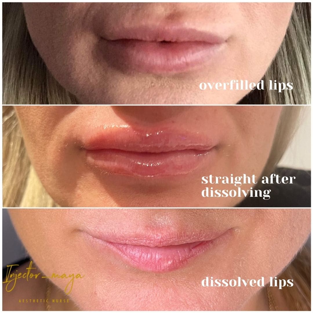 The reason of dermal filler dissolving might be due to overfilled lips or other areas, lumps and unevenness of dermal filler result, allergic reaction (prolonged swelling), infection, visible asymmetry or late reaction (swollen lumps at the filler areas which are usually seen at tear through areas even a few months after the filler has been injected).